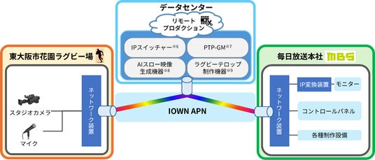 本取り組みでは、NTTスマートコネクトのデータセンターと東大阪市花園ラグビー場および毎日放送本社を、IOWN APNの技術を活用した「All-Photonics Connect powered by IOWN」※5にて接続した上で、中継制作の核となる主要な制作機能(IPスイッチャー※6、PTPグランドマスター※7)をデータセンターに集約しました。この環境を用いて毎日放送本社から、IOWN APNの超低遅延ネットワークを通じてデータセンター上の制作システムを遠隔操作することで、スイッチャーやミキサー担当者が現場にいなくとも地上波放送向けの高品質な番組制作が可能であることを実証しました。