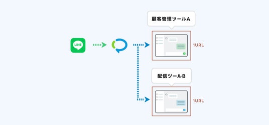 そこで、CRM PLUS on LINEでは新たに「Wehookの転送機能」をリリースしました。本機能を活用することにより、LINEのWebhookを必要とするツールを最大3つまで併用可能になりました。