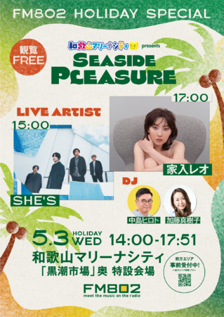 FM802が毎年「海の日」、「文化の日」のスペシャルプログラムとしてお届けしている和歌山マリーナシティからの公開生放送。今年は、ゴールデンウィーク真っ只中の5月3日にも開催決定!和歌山の"海と太陽"をバックに、ゲストアーティストのスペシャルライブをはじめ、大型連休を彩る「音楽」と「情報」を厳選してお送りします。