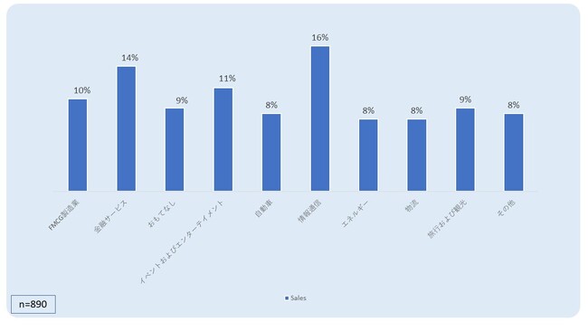 回答者は幅広い業界を代表しており、情報通信技術 (15.7%) と金融サービス (13.5%) がトップでした。 回答者には日用消費財製造、ホスピタリティ、イベントとエンターテイメント、自動車、エネルギー、物流、旅行・観光などの代表者も含まれており、それぞれの割合は回答者全体の 12% 未満でした。