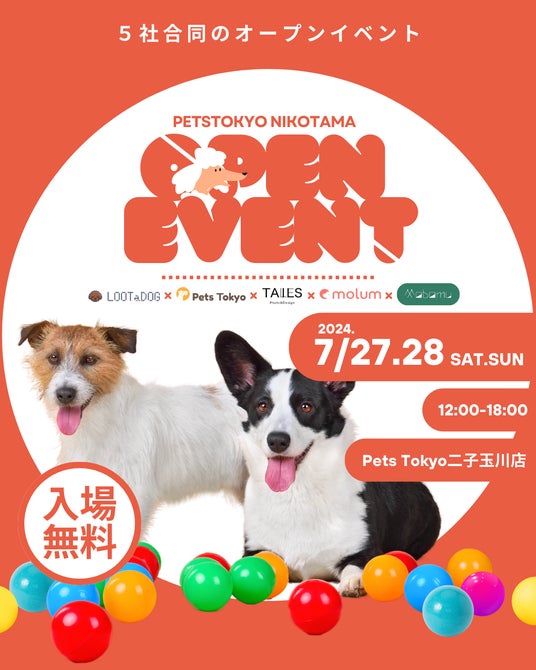 株式会社LOOTaDOG Japan(本社:東京都、代表取締役:内田 遼)は、Pets Tokyo株式会社、テイルズ、molum、mobomuの5社と共同で、2024年7月27日(土)および28日(日)に、オープン前のペットケア専門店「Pets Tokyo二子玉川店」にて特別なオフラインイベントを開催いたします。