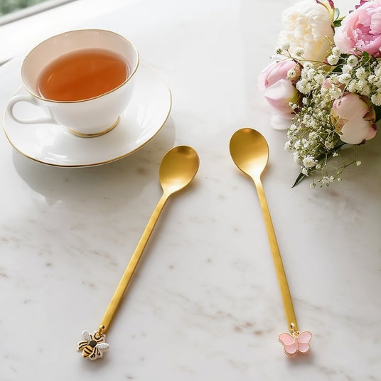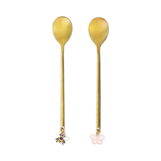 ゆらゆら揺れる、ハチと蝶々のチャームがキュート。ティーカップに添えても、デザートを食べる時に使っても◎