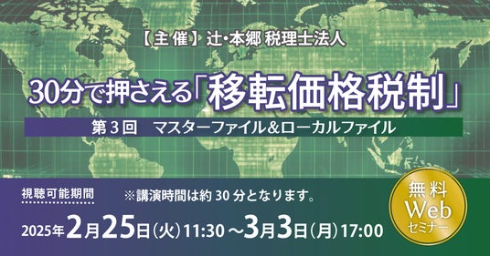 辻・本郷 税理士法人(本社:東京都新宿区、理事長:桑木小恵子)は、2025年2月25日(火)より「30分で押さえる「移転価格税制」(第3回)マスターファイル&ローカルファイル」セミナーを開催いたします。第3回は、引き続き移転価格税制の基礎編として、移転価格文書化対応のなかでも重要な要素である「事業概況報告事項(マスターファイル)」と「独立企業間価格の算定に必要な書類 (ローカルファイル)」について解説します。それぞれの文書の概要および求められる具体的な記載内容や作成の際の注意点について、また、移転価格税制に関する最新動向や実務担当者の疑問に応える実践的な情報をお届けします。