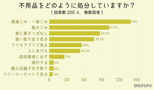 不用品をどのように処分しているかを尋ねたところ、1位は「普通ごみ・一般ごみ(70%)」、2位「粗大ごみ(51.5%)」となりました。不用品をお店やアプリで売ったり、人に譲ったりしている方はそこまで多くはないようです。ゴミとして捨てる方がやっぱり楽なのかもしれませんね。