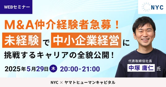 ヤマトヒューマンキャピタル株式会社(本社:東京都千代田区、代表取締役:堀江 大介)は、2025年5月29日(木) 20:00よりオンラインにて、NYC株式会社 代表取締役社長 中塚 庸仁 氏にご登壇いただくウェビナー『中小企業経営に挑戦するキャリアの全貌公開!』を開催いたします。