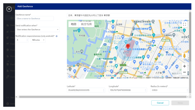 MoEngageではジオフェンシングも簡単に設定することが可能です。