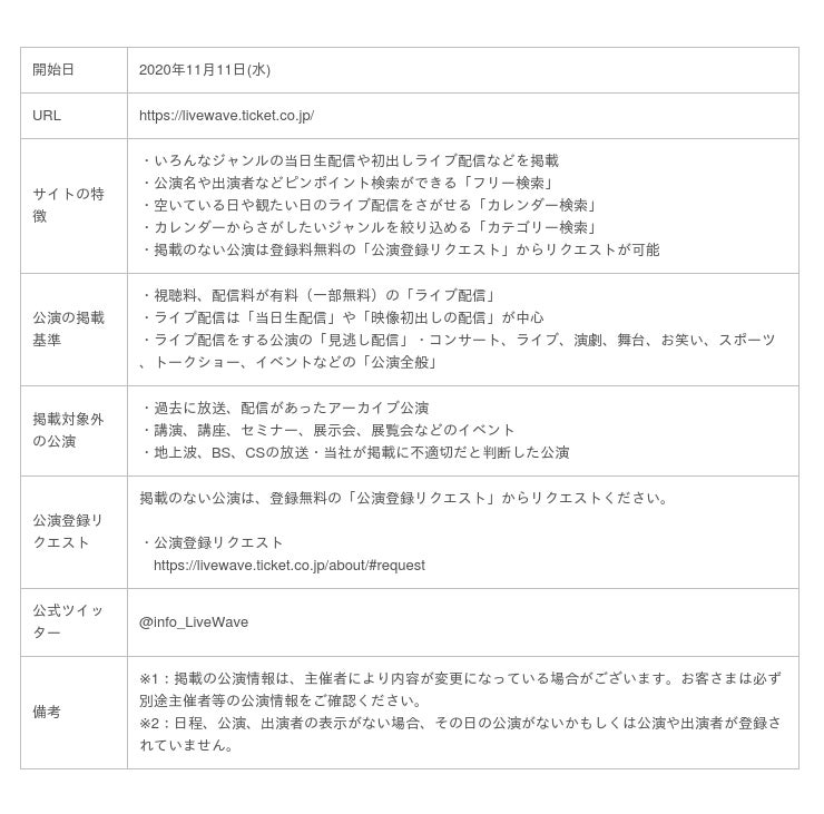 株式会社ウェイブダッシュ(本社:東京都千代田区、代表取締役 河野 由紀)は、コンサート、ライブ、演劇、舞台、スポーツ、トークショー、イベント等のライブ配信を探せるライブ配信専用検索サイト「LiveWave(ライブウェイブ)」のサイトを11月11日(水)にオープンしました。(https://livewave.ticket.co.jp/)
