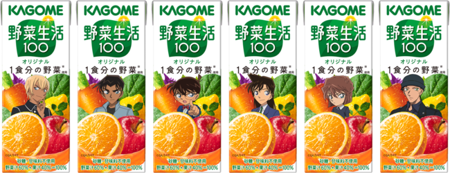 「野菜生活100」4種(オリジナル・ベリーサラダ・マンゴーサラダ・アップルサラダ)の各容器(200ml、720ml、1000ml)で、『名探偵コナン』に登場するキャラクターがデザインされた限定パッケージを販売いたします。「野菜生活100 」のパッケージの正面に『名探偵コナン』のキャラクターがデザインされるのは今回が初めてです。全国のスーパーマーケット及びドラッグストア等で、9月下旬より数量限定で販売となります。