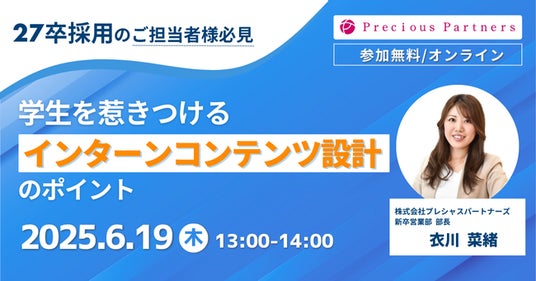 採用コンサルティング事業を行う株式会社プレシャスパートナーズ(本社:東京都新宿区、代表取締役社長 CEO:高崎 誠司)は、2025年6月19日(木)に『【27卒採用担当向け】学生を惹きつけるインターンコンテンツ設計のポイント』をオンラインにて開催いたします。
