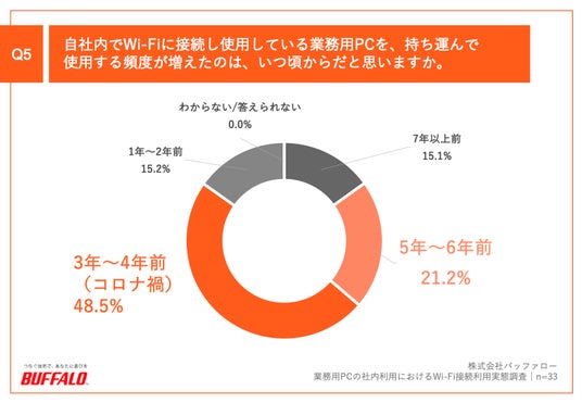 Q4で「かなり増えた」「やや増えた」と回答した方に、「Q5.自社内でWi-Fiに接続し使用している業務用PCを、持ち運んで使用する頻度が増えたのは、いつ頃からだと思いますか。」(n=33)と質問したところ、「3年~4年前(コロナ禍)」が48.5%、「5年~6年前」が21.2%という回答となりました。