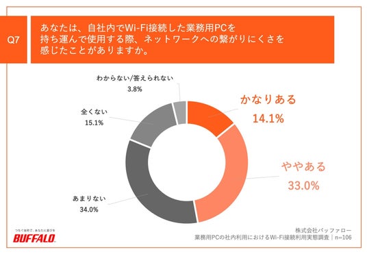 「Q7.あなたは、自社内でWi-Fi接続した業務用PCを持ち運んで使用する際、ネットワークへの繋がりにくさを感じたことがありますか。」(n=106)と質問したところ、「かなりある」が14.1%、「ややある」が33.0%という回答となりました。