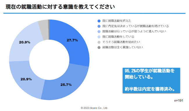 2023年5月時点で24卒理系学生の95%以上が就職活動を開始しており、半数以上は既に内定を獲得しています。全体の25%程度は内定を持ちながらも就職活動を続けており、就職先を確定させていない学生はまだ多いようです。採用活動中の企業としては、キャリア選択を真剣に考えたい学生にも配慮し、採用候補者に対し、自社を選んでいただけるような魅力づけ・情報提供をしていくことが重要となります。理系学生が企業選びにおいて重視している「成長できる環境」を如何にしてPRしながらアプローチできるかがポイントとなりそうです。