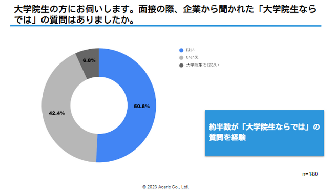 理系大学院生の半数以上が「大学院生ならでは」の質問を経験。内容は「進学理由」「研究内容」「民間企業就職を選んだ理由」など