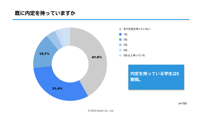 「既に内定を持っていますか」と質問したところ、6割弱の学生が1社以上の内定を持っていると回答しました。