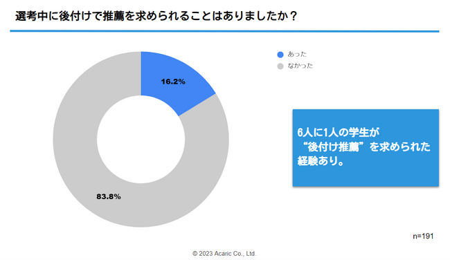 後付け推薦(選考が進んだ段階で企業が学生に推薦状の提出を求める行為)について、「選考中に後付けで推薦を求められることはありましたか」と質問したところ、16.2%の学生があったと回答しました。報道などでも話題となった「後付け推薦」ですが、求められるケースは一定数あるようです。
