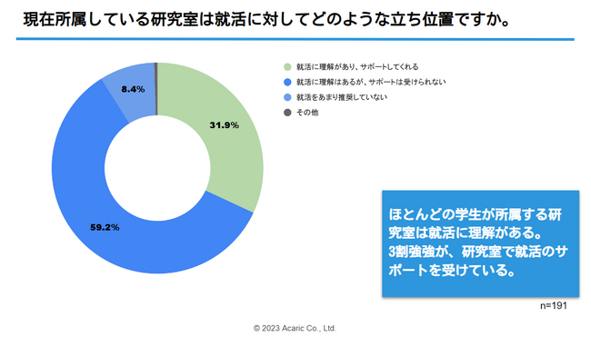 就活に対する研究室のスタンスについて、9割強の学生は「就活に理解がある」と回答。3割強は研究室でのサポートも受ける