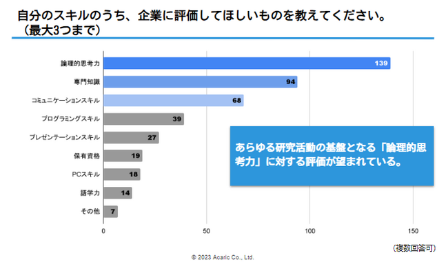 「自分のスキルのうち、企業に評価してほしいものを教えてください」と質問したところ、最も多かったのは「論理的思考力」で139件の回答となっており、7割以上の学生が選択しています。専門分野を問わず、あらゆる研究活動で培われる汎用的能力である論理的思考力に自信がある学生が多く、そこを評価してほしいと考えているようです。