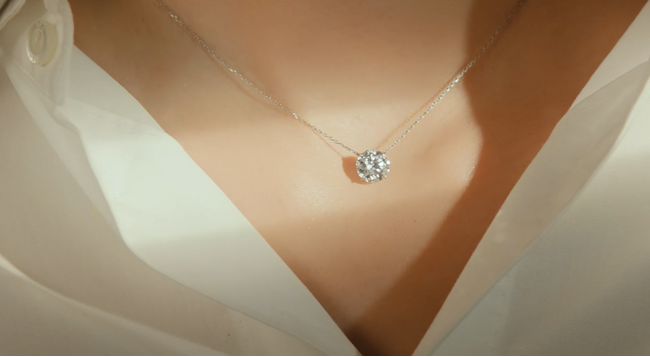 20代の頃は小さなダイヤモンドのネックレスを着けていたけれど、時を経て今の自分に似合う大きさのダイヤモンドを見つけた女性の喜びとリアルな美しさが切り取られています。