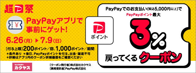 株式会社カクヤス(東京都北区、代表取締役社長:佐藤順一、以下:当社)は、お酒の販売、デリバリーをする「なんでも酒やカクヤス」のネットショッピングサイトにてスタートしたID決済サービスを記念し、2023年6月26日(月)から7月9日(日)の期間中「PayPayポイント最大3%戻ってくるクーポン」を配布します。ぜひこの機会にお得なPayPay決済をご利用いただき、デリバリーを通して“よい、ひととき”をお過ごしください。
