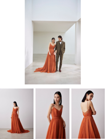 トレンドのブライズスタイルが叶うアプリコットオレンジのスレンダーラインドレス。