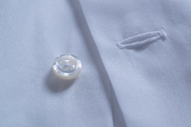 機能性を配慮し、留め外しのしやすさと上質さを追求した特注のボタンを採用。ボタンホールは、一番下を横に開けることでボタンを外しやすくしています。本格シャツにしばしば採用されるディテールです。