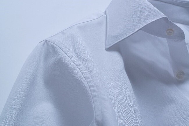 袖と身頃のつなぎ目に走る縦2本のステッチワークは、既存のオーダーシャツよりもステッチの間隔を狭くしています。これにより肩周りがすっきりと見え、一枚で着たときの美しさをアップさせています。ジャケットやネクタイを着用せずとも洗練された印象で、クールビズにも適しています。