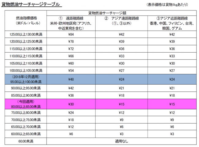 JALは、2019年1月1日から適用となる日本発国際貨物燃油サーチャージを、本日、国土交通省へ申請しました。基準となる2018年11月のジェット燃料の平均価格が1バレル当たり83.16米ドルであったことから、燃油指標価格を「80.00以上85.00未満」とし、サーチャージ額は1kgあたり30円(米州・欧州など遠距離路線)、15円(アジア遠距離路線)、15円(アジア近距離路線)となります。