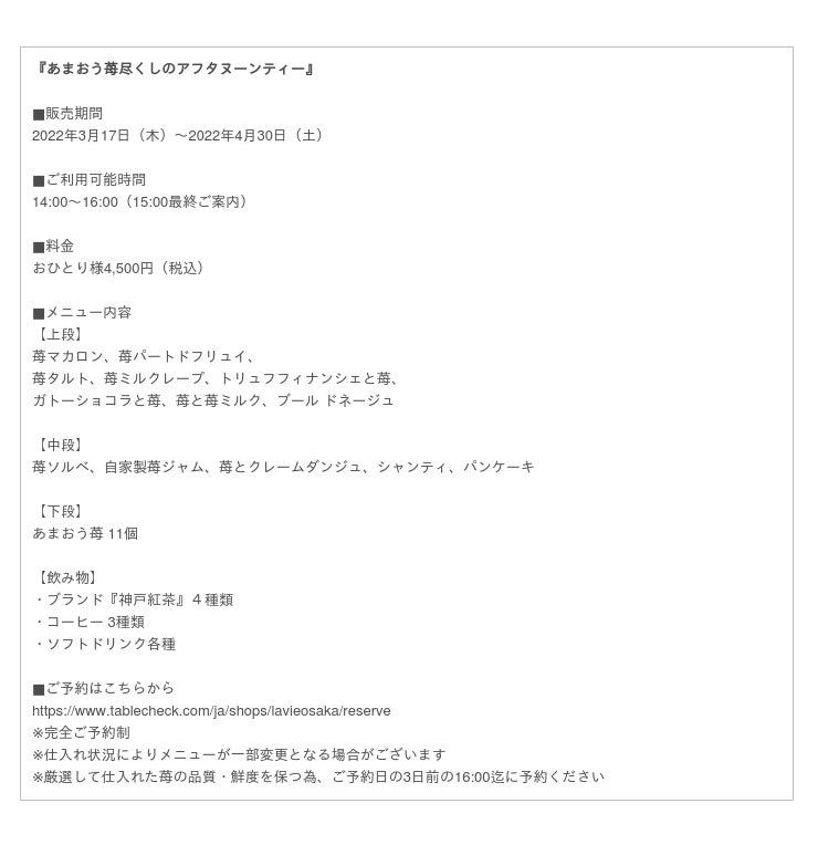 GLIONグループ(ジーライオングループ 所在地:兵庫県神戸市)は、同グループが運営する大阪築港・赤レンガ倉庫のLA VIE 1923にて2022年3月17日(木)から2022年4月30日(土)までの期間限定で、あまおう苺をふんだんに使用した「あまおう苺尽くしのアフターヌーンティー」を販売いたします。