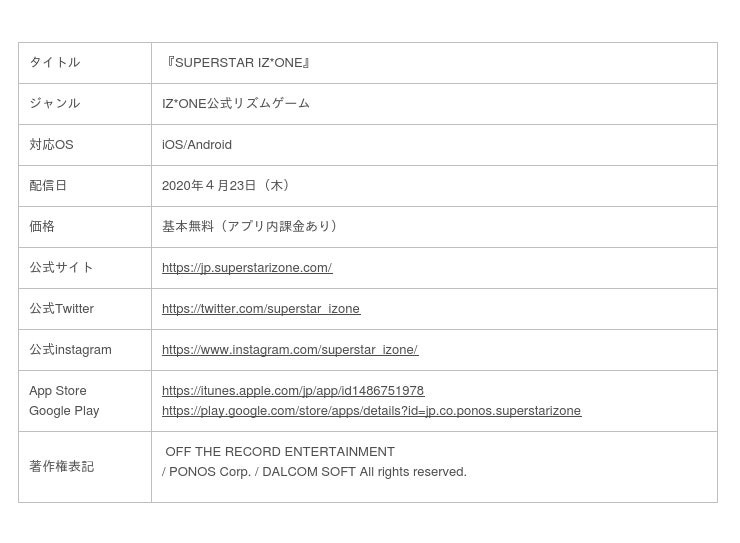 ポノス株式会社(本社:京都府京都市、代表取締役:辻子依旦、以下「ポノス」)は、グローバル人気女性アイドルグループ「IZ*ONE(アイズワン)」の公式リズムゲーム『SUPERSTAR IZ*ONE』(公式サイト:https://jp.superstarizone.com/)が4月23日(木)にサービスを開始したことをお知らせいたします。