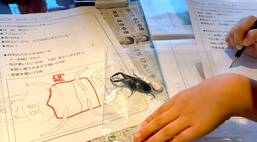◆図2:理科生物コース「事前に郵送された本物のクワガタを観察しながらのスケッチ」 *2022夏季実施授業の様子<こちらの授業はすでに終了しています>