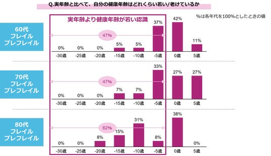 「実年齢と比べて、自分の健康状態はどれくらい若い/老けているか」という質問に対する回答を見ると、「フレイル」・「プレフレイル」の状態にある方々のうち、60代と70代では47%、80代では62%が実年齢と比べて自分の健康状態は若いと答えていました。