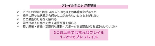 「フレイル」は老化に伴って身体的・精神的・社会的な脆弱性が増加し、日常生活の自立が困難になる状態を指し、J-CHS基準をベースとした簡易チェックで確認ができます。