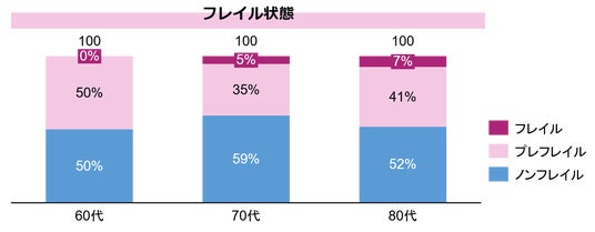 簡易質問形式で確認したところ、60代では50%、70代では40%、80代では48%の人が、フレイルに移行する前のプレフレイルの状況か、既にフレイル状況にあることが分かりました。