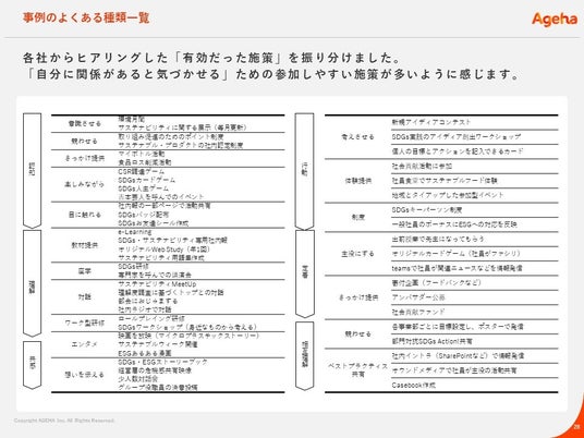 各社のヒアリング結果から、映画鑑賞や、カードゲームなど「自分に関係がある」と気付かせるための参加ハードルが低い施策が有効であることがわかりました。