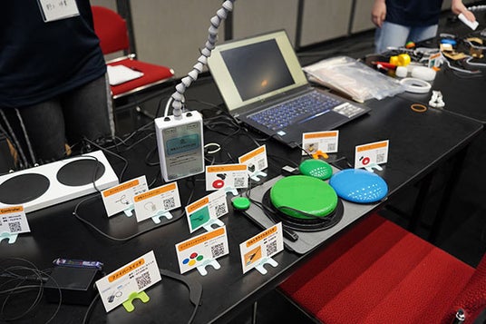 まばたきや呼気などで入力できるデバイスや、医療現場で制作されたさまざまな手作りスイッチなど、貴重な端末も体験できた