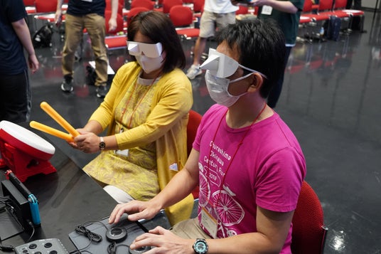 手作りのメガネ型装具で視覚障がいの見え方を簡易的に再現し、アクセシビリティに対応しているFlex Controllerによるゲームプレイを体験