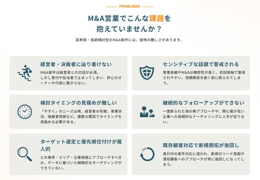 M&Aは高単価かつ検討期間が長く、初回接触での警戒感も強いため、通常の営業手法では商談につながりにくい領域です。一方で、継続的なフォローや検討タイミングの見極めが重要であるにもかかわらず、十分な体制を構築できていない企業も少なくありません。