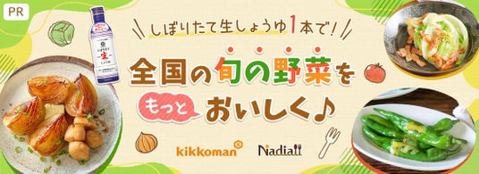Nadia株式会社(東京都港区/代表取締役社長 葛城 嘉紀 以下「Nadia」)とキッコーマン食品株式会社(東京都港区/代表取締役社長 中野 祥三郎 以下「キッコーマン」)がタイアップし、「しぼりたて生しょうゆ1本で!全国の旬の野菜をもっとおいしく♪」を公開いたしました。ご当地の旬野菜を「いつでも新鮮 しぼりたて生しょうゆ」でもっとおいしく楽しんでいただきたいという想いで、Nadia Artistによるアレンジレシピを掲載します。
