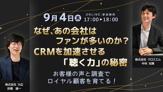 株式会社大広(本社:東京都港区、代表取締役社長:泉恭雄、以下「大広」)は、「なぜ、あの会社はファンが多いのか?CRMを加速させる「聴く力」の秘密~お客様の声と調査でロイヤル顧客を育てる!~」について無料オンラインセミナーを開催いたします。