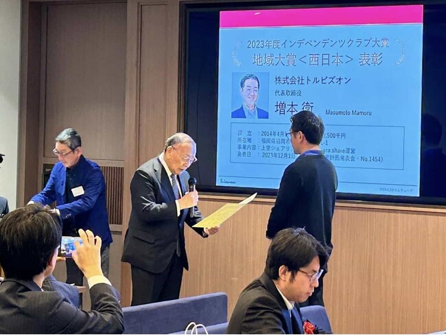 インデペンデンツクラブ大賞は、全国の有望なベンチャー企業を対象に、その革新性や成長性を評価して授与される権威ある賞です。2023年度「インデペンデンツクラブ大賞」では、2024年4月1日~19日に行われた会員の方の "地域大賞投票" により「北日本」「関東」「中部」「関西」「西日本」の5地域から「地域大賞」を各1社、全5社を選出、トルビズオンは「西日本」の地域大賞に選出されておりました。