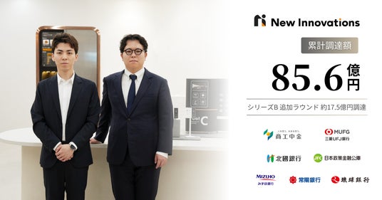 株式会社New Innovations(本社:東京都江東区、代表取締役:中尾 渓人、山田 奨、以下「New Innovations」)は、株式会社商工組合中央金庫、株式会社三菱UFJ銀行等を引受先とするデットファイナンスにより、シリーズB追加ラウンドで17.5億円の資金調達を実施しました。これにより、創業からの累計調達額は85.6億円となります。