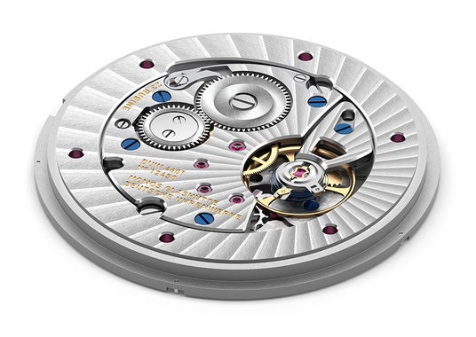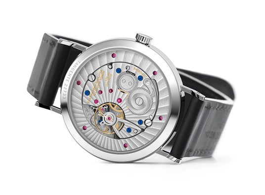 豊かな装飾が施された新しいムーブメントは、日付リングのプレートを含む特大ディスプレイの裏面のサファイアクリスタルを通して見ることができます。内側に施された反射防止コーティングによって、この眺めをよりクリアなものにしています。