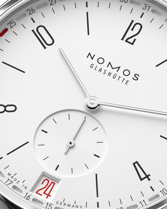 ノモス独自のリングデイトはその独特な個性あふれるデザインで数々の賞を受賞し、これまでは機械式自動巻時計のみに使用されてきましたが、手巻き式の時計では「タンジェント 2デイト」が初めての採用となります。複雑な技術をデザインに融合させ、リングデイトは月の経過を表示し、6時位置の大きな日付ウインドウは日に焦点を合わせます。午前0時、またはクイックセット機能を作動させると、この2つの表示がダイアルとロジウムプレートの針を二重に美しく動かします。