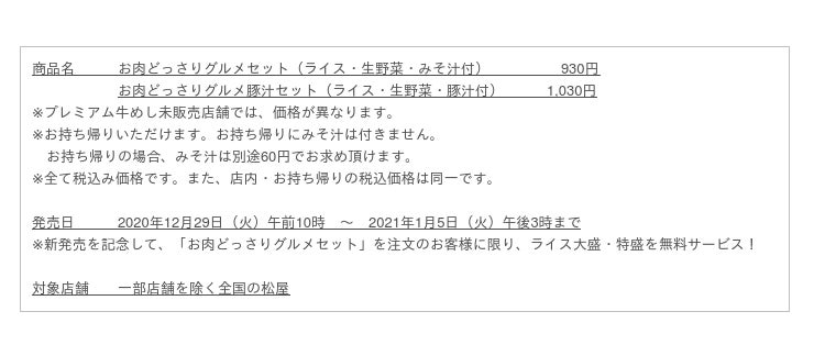 このたび松屋フーズ(本社:東京都武蔵野市、代表取締役社長:瓦葺一利)では、牛めし・カレー・定食・その他丼の「松屋」におきまして、2020年12月29日(火)より「お肉どっさりグルメセット」を発売いたします。