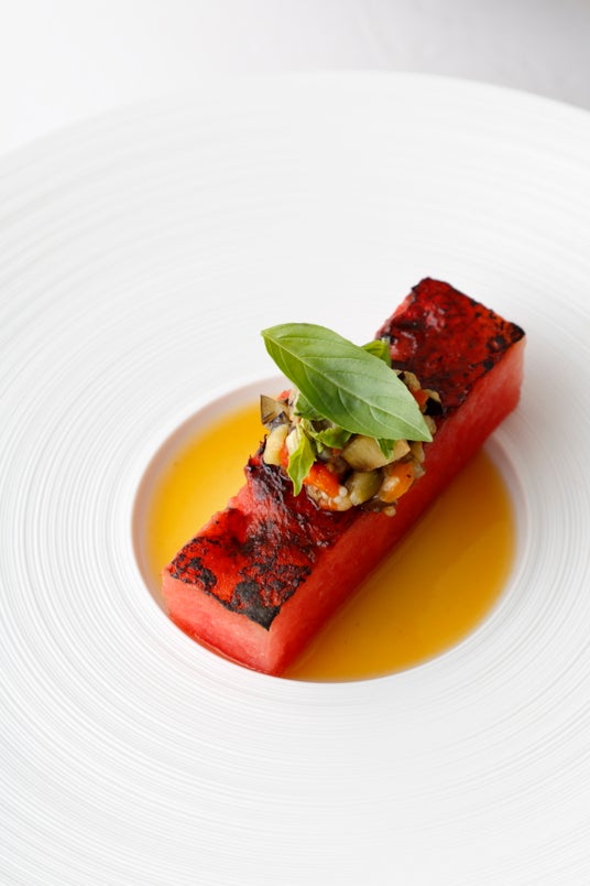 片面をソテーしトマトと焼なすのガルニチュールとバジルで仕上げた新しいスイカの魅力を楽しめる一皿です。