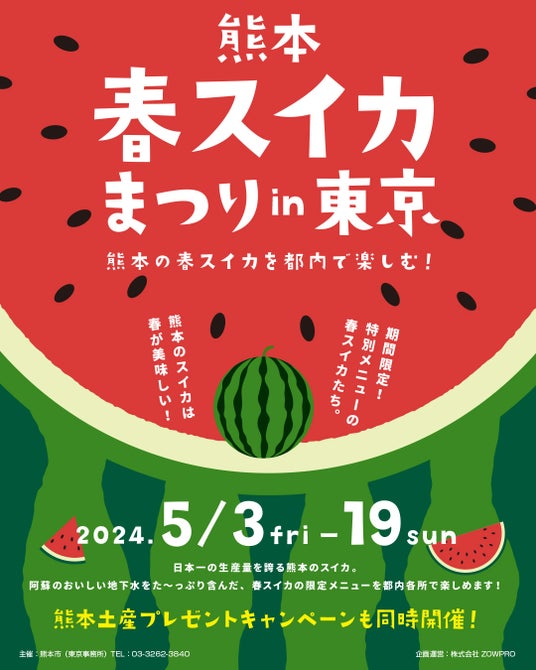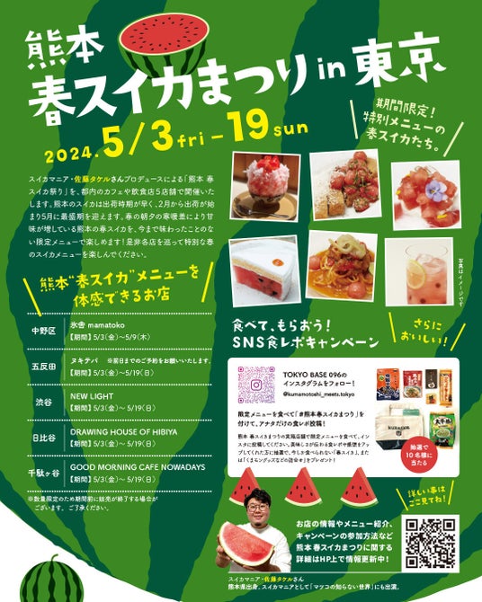 また、2024年5月3日(金)からは、スイカマニア・佐藤タケルさんプロデュースによる「熊本春スイカまつり」を、都内のカフェや飲食店5店舗で開催いたします。熊本のスイカは出荷時期が早く、2月から出荷が始まり、5月に最盛期を迎えます。春の朝夕の寒暖差により甘味が増している熊本の春スイカを、是非ご体感ください。
