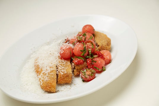 お箸で切れるほど口溶け良く柔らかく煮た米澤豚の肩ロースをとんかつの様に揚げフレッシュなすいかの甘みとセミドライトマトの旨みのあるソースを合わせ