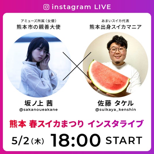 インスタライブでは、スイカマニア・佐藤タケルさんが厳選した熊本のスイカをご紹介するとともに、熊本市親善大使・坂ノ上茜さんに実際に食べてもらい、味や感想を伝えていただきます。日本一の熊本スイカの魅力を知っていただけることはもちろん、お二人の地元(熊本)トークや、世界のセレブも愛するスイカと美容の関係などもお楽しみいただけます。また、都内で開催する「熊本春スイカまつり」や、熊本のスイカが抽選で当たるキャンペーンのお知らせもあります。