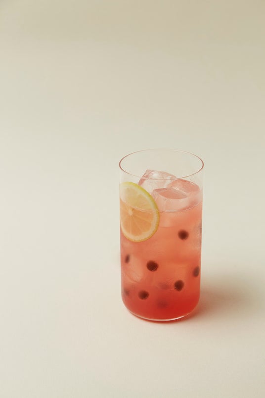 スイカシロップを使用したスイカのレモネード。こちらもビーツコーディアルを使用しており、スイカのタネに見立てたタピオカをアクセントに感じられます。