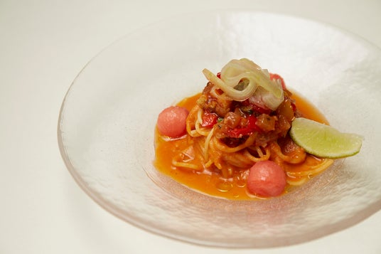 すいかとトマトや数種類の野菜で作ったガスパチョとフェデリーニを組み合わせた冷製パスタ。すいかの果肉、すいかの皮入りのカポナータやすいかの皮のピクルスなどすいかを贅沢に使った一品です。